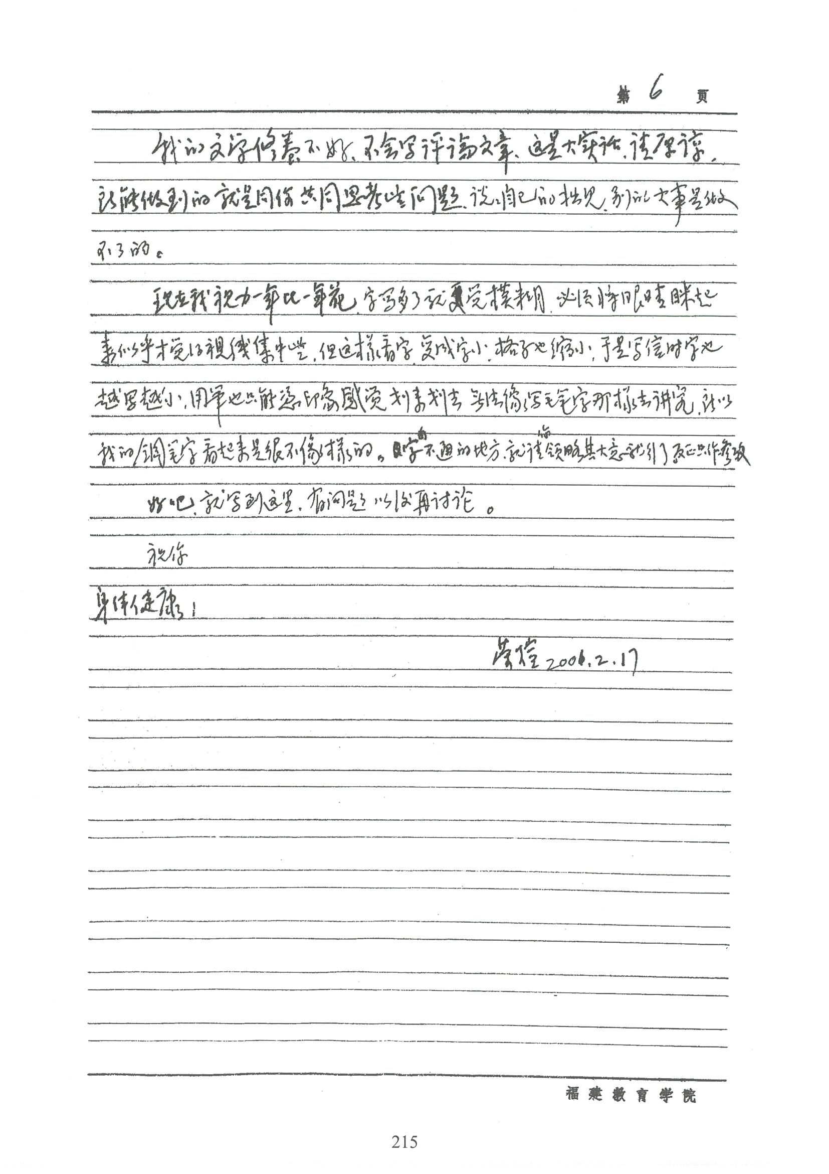 收到寄来茶叶一盒,书集三本,非常感谢!看到得先先生的墨迹,如同参观一次别开生面的书展,一饱眼福,并且不禁引起赞叹和对先生的崇敬之情。得先先生是我诏真真正正的书法篆刻家,是独一无二的碑体书法的先导和先师,也是诏安文坛艺苑的一颗明珠。但可惜的是先生长期侨居海外,留给家乡的宝物太少了(包括你家),致使诏安人很少认识和了解先生,他的艺术风范无能在诏安声扬,他的技艺只能孤芳自赏,不能让大家学习受益!好了,如今有了这些书文墨迹结集面世,或许可以弥补过去的许多遗憾,让先生的业绩和风采重新展现在世人面前,让明珠的光芒闪烁照射在书画之乡的艺坛。