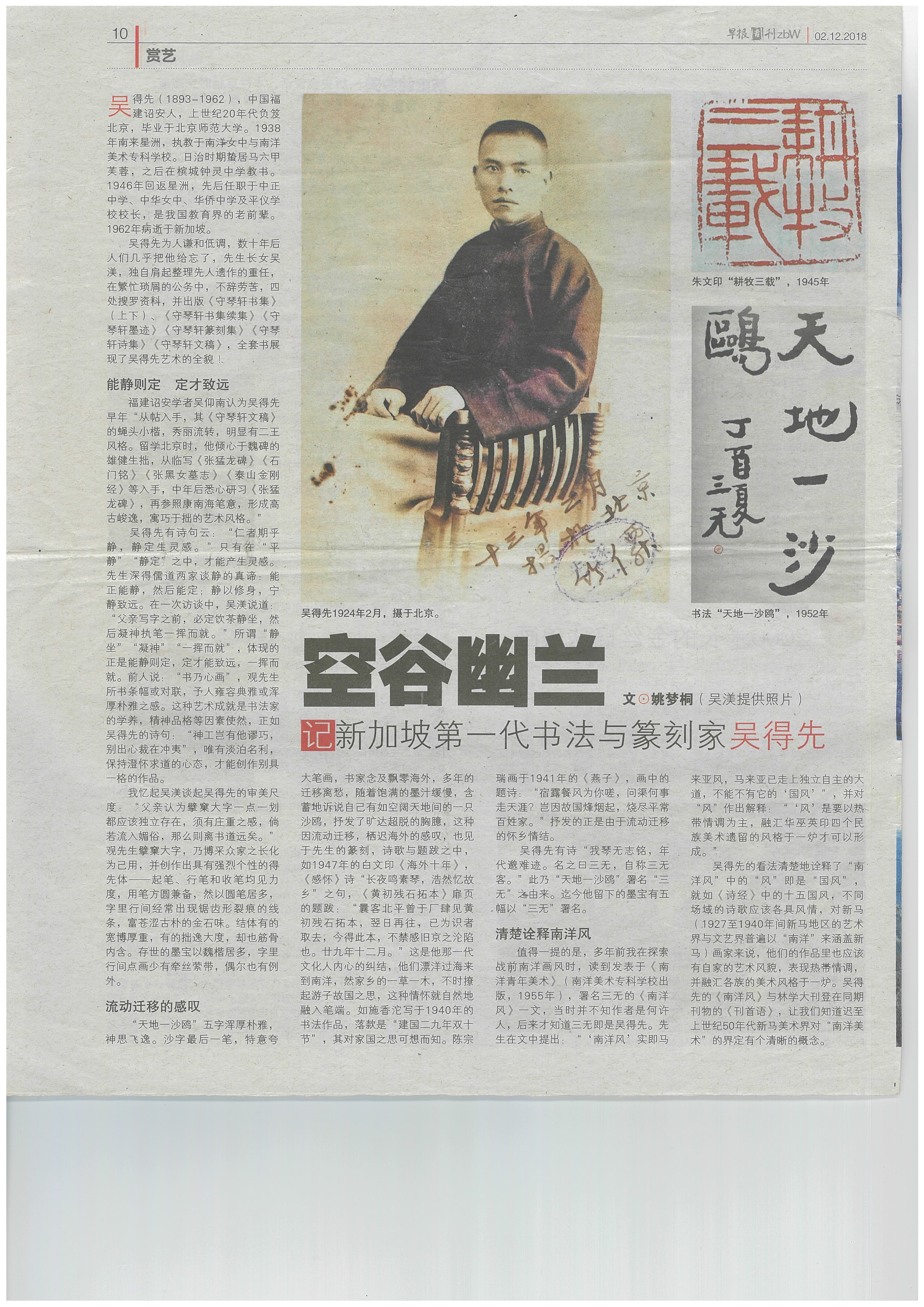 空谷幽兰 ——记新加坡第一代书法与篆刻家吴得先 姚梦桐 吴得先(1893-1962),中国福建诏安人,上世纪20…... 详情>>