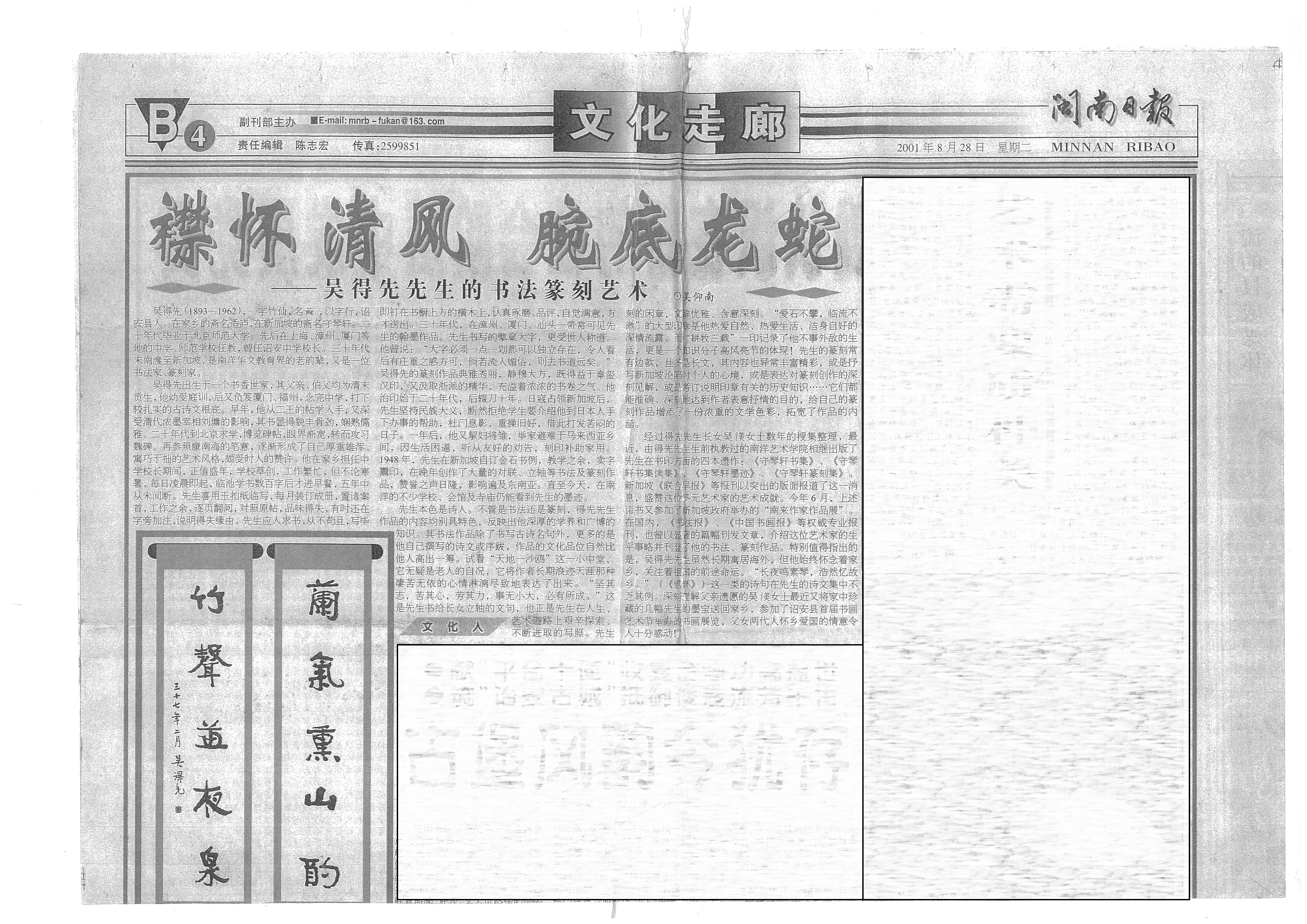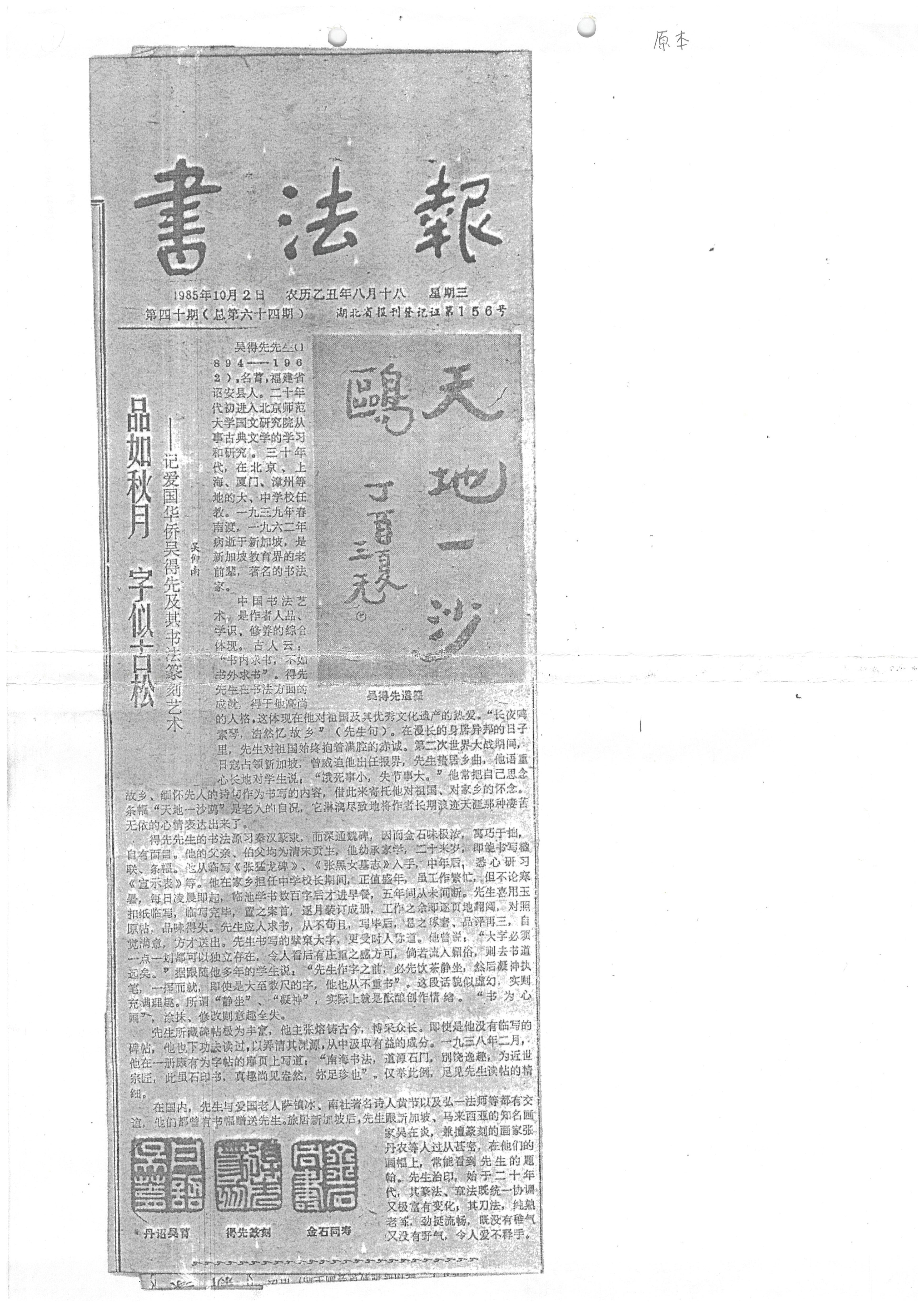 02/10/1985 书法报(第四十期 总第64期) (湖北省报刊 登记证第156号) 品如秋月 字似古松 记爱国华侨吴得先及…... 详情>>