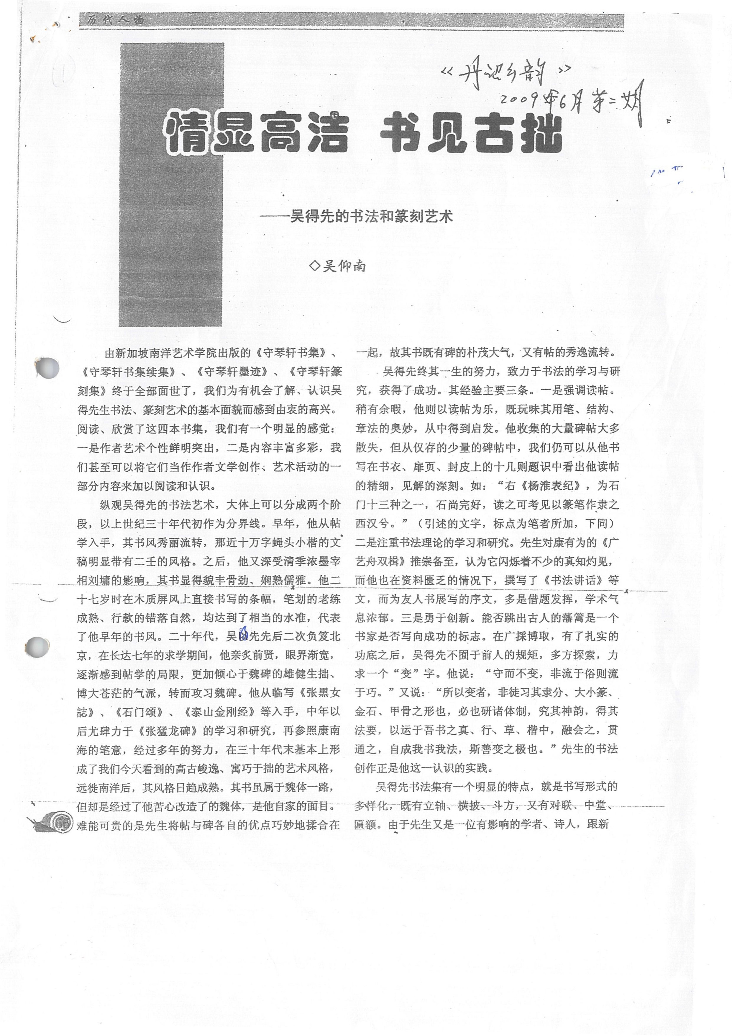 2009年6月 《丹诏乡韵》2009年6月第二期 情显高洁 书见古拙 ——吴得先的书法和篆刻艺术 吴仰南 由新加坡南…... 详情>>
